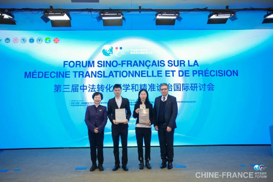 广慈基金会理事长陈赛娟院士,法国梅里埃基金会科研主管Pascal Vincelot为中国有法文教学传统的医学院校优秀学者代表颁发证书。